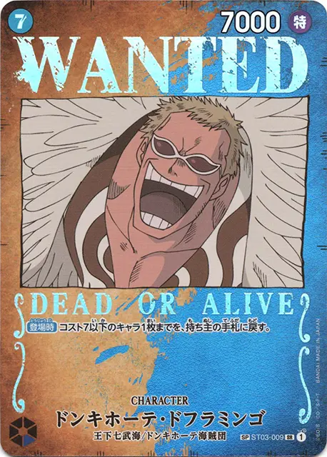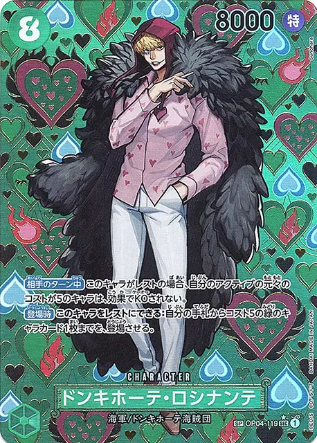 | テキスト 起動メイン自分のドン‼1枚をレストにし、このキャラをレストにできる:自分のデッキの上から5枚を見て、特徴《ドンキホーテ海賊団》を持つカード1枚までを公開し、手札に加える。その後、残りを好きな順番でデッキの下に置く。 | |||