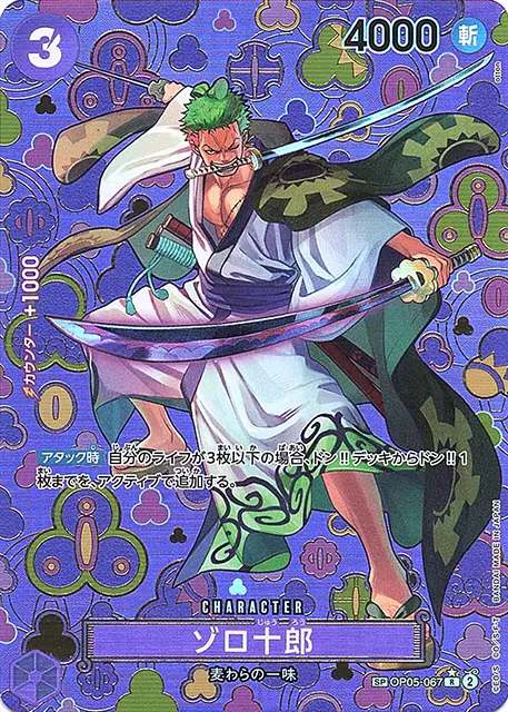 | テキスト 自分のリーダーが多色で、相手の場のドン‼が5枚以上ある場合、このキャラは速攻を得る。 アタック時ターン1回自分のアクティブのドン‼2枚をドン‼デッキに戻すことができる:このキャラをアクティブにする。その後、自分のライフの上から1枚を手札に加える。 | |||