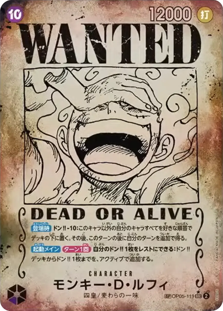 | テキスト 登場時自分のライフの上から1枚をトラッシュに置くことができる:自分のリーダーが特徴《麦わらの一味》を持つ場合、自分のデッキの上から2枚までを、ライフの上に加える。 相手のターン中KO時相手に1ダメージを与えてもよい。 | |||