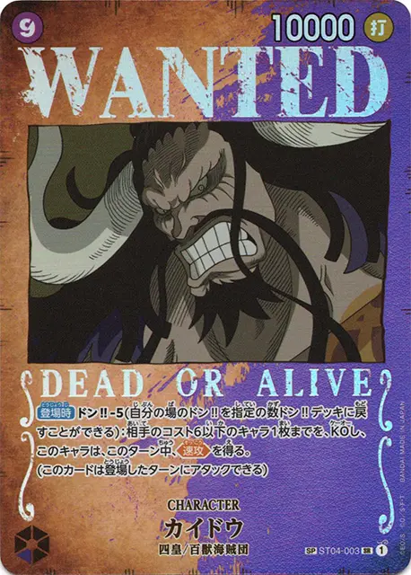 | テキスト 速攻(このカードは登場したターンにアタックできる) ドン!!×2アタック時相手は、このバトル中、ブロッカーを発動できない。 | |||