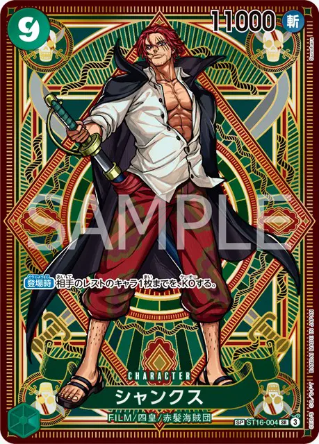 | テキスト 登場時自分のリーダーが「ウタ」の場合、カード2枚を引く。その後、自分の手札からパワー6000以下の元々の効果のないキャラカード1枚までを、登場させる。 | |||